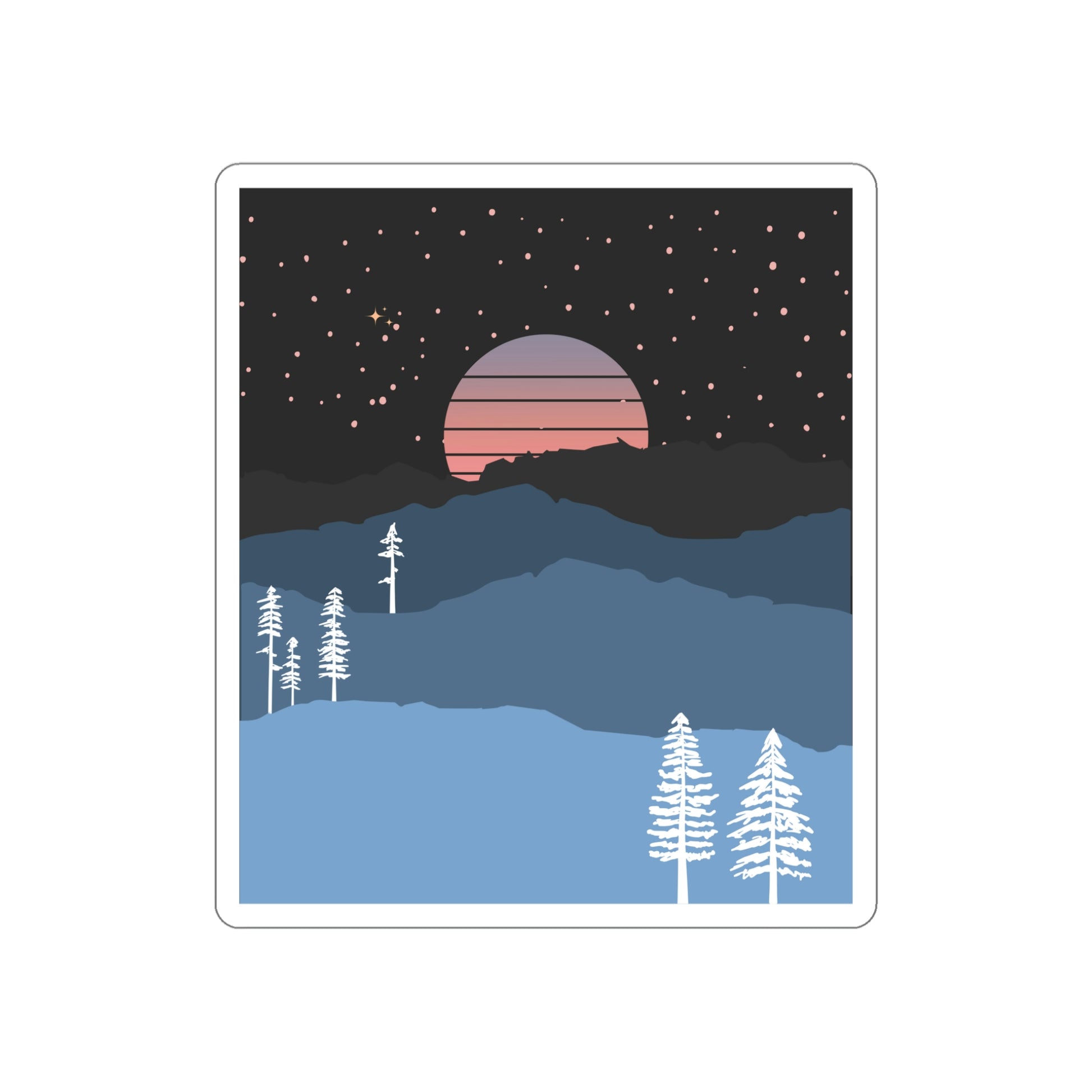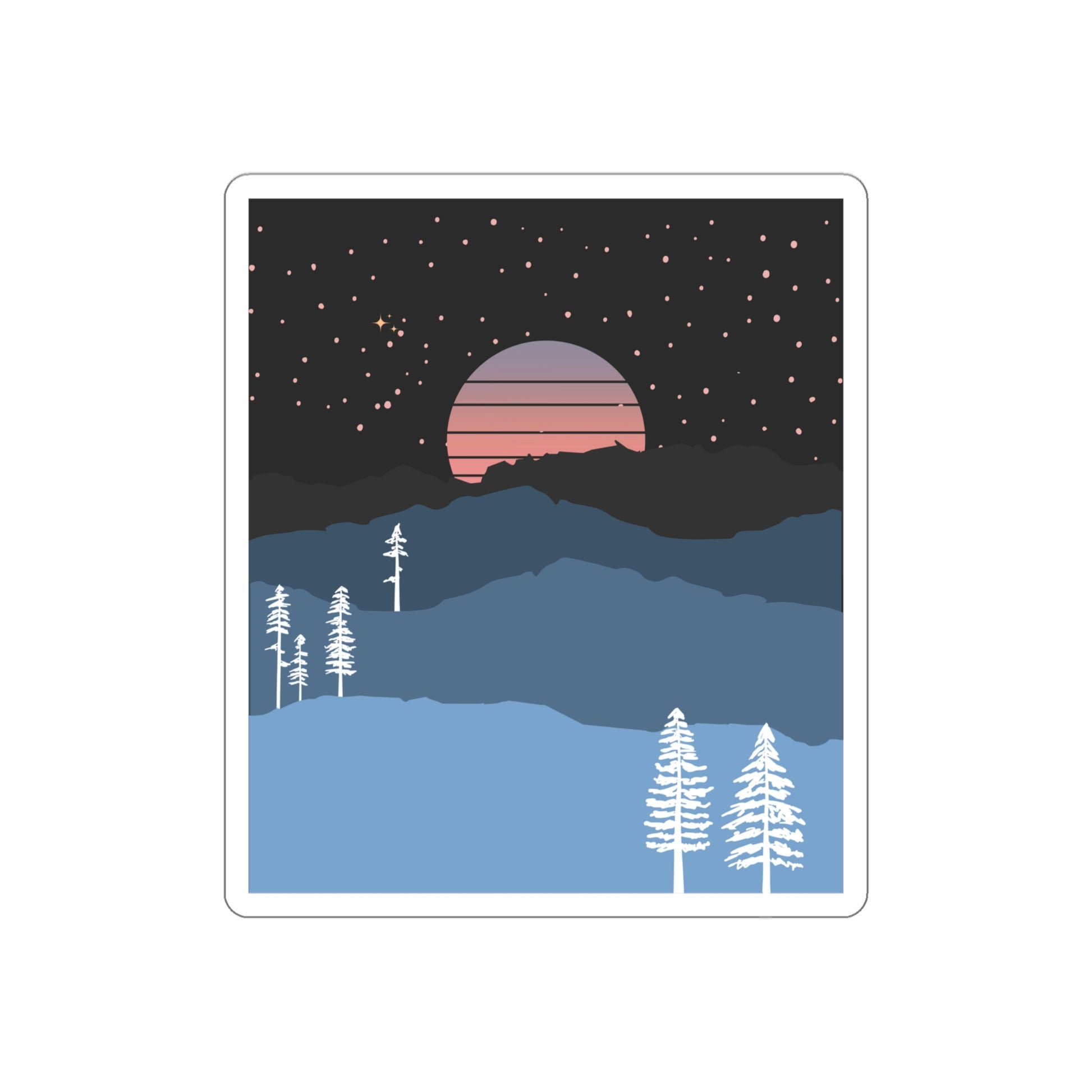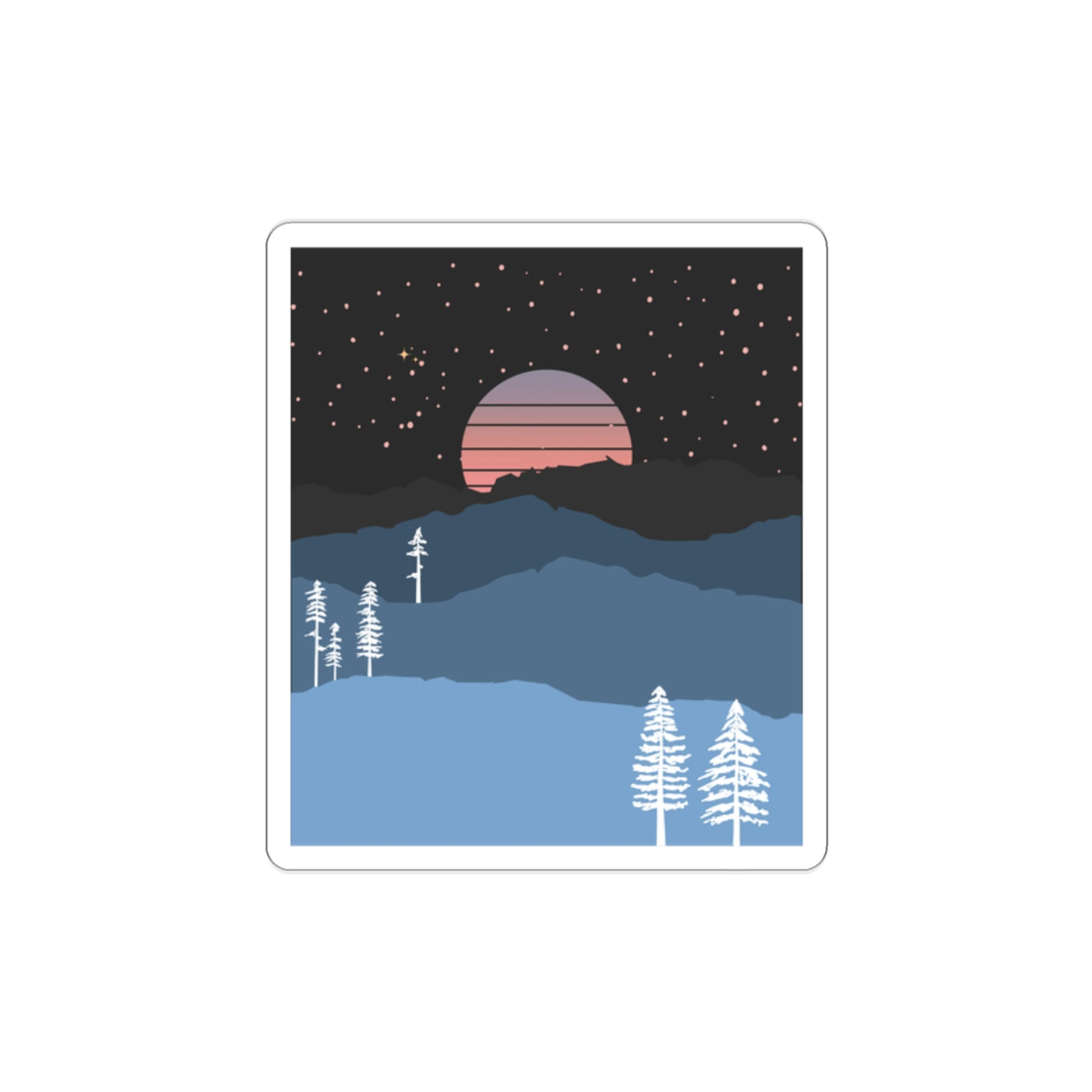 The Mountain Moon Rise Die-Cut Stickers are great for both indoor and outdoor use as they are made with thick, resistant, laminate vinyl material with easy-peel backing and matte finish.